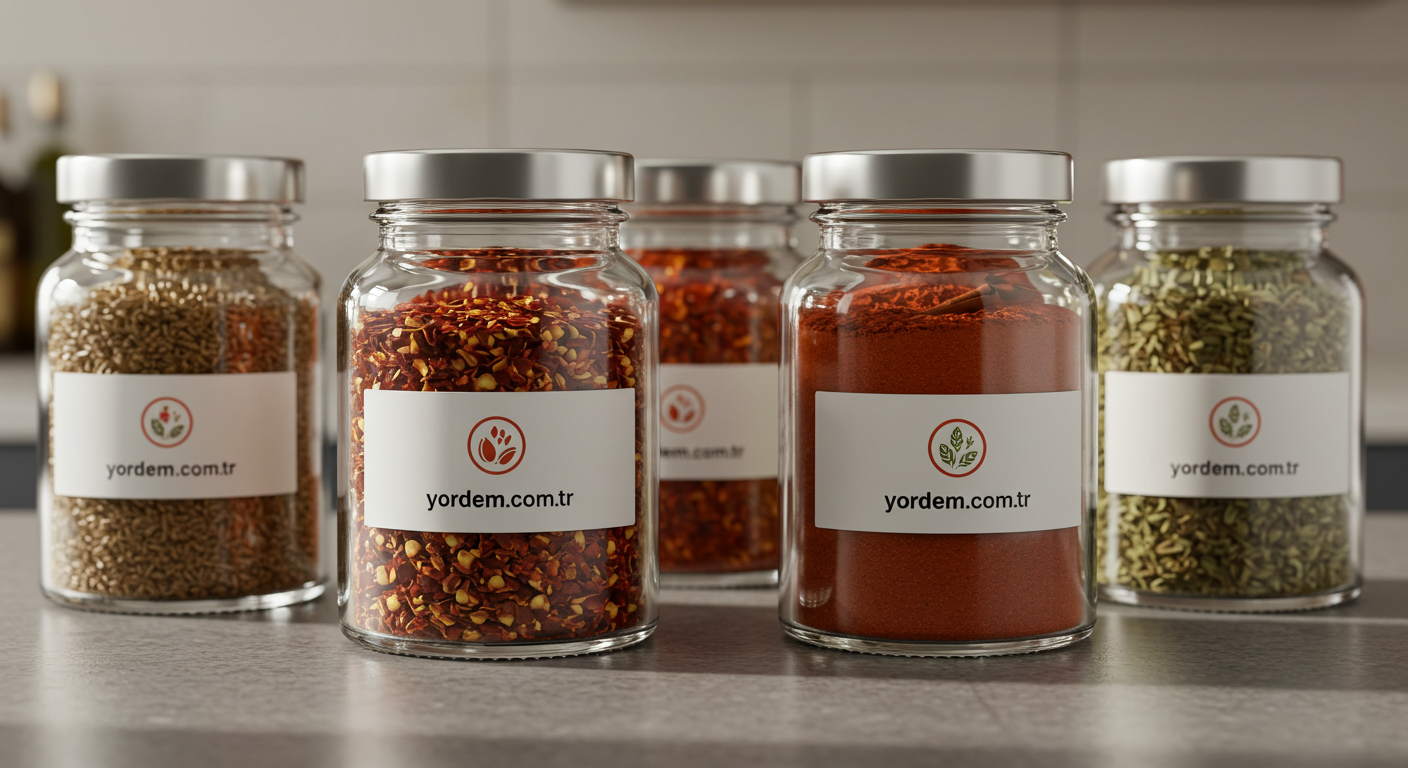 Kekik, kimyon, karabiber, nane, pul biber, tarçın gibi pek çok baharat çeşidinde etiketler, hem ürünün içeriğini hem de markanın kimliğini vurgular. Baharat etiketleri, ürünün tazeliğini yansıtacak şekilde tasarlanır ve tüketicinin dikkatini çeker.